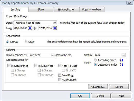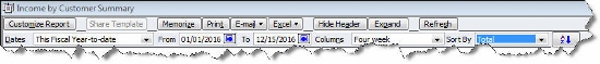 Open the Income by Customer Summary report (Reports | Company & Financial). Change the dates to reflect a range you’d like to see. Want the data displayed by different time increments — like week or quarter — instead of just the total? Click the arrow next to Columns and select Four week.