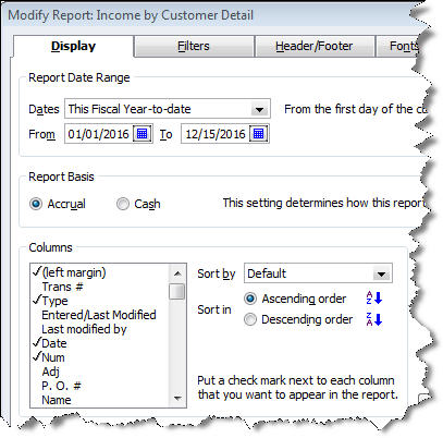 Some of the options here duplicate what you saw in the toolbar. In addition, you can switch between Accrual and Cash for just this report, and add subcolumns in some. The latter is a complicated operation, one that you must understand well in order to glean any insight from it. We can help you with this.